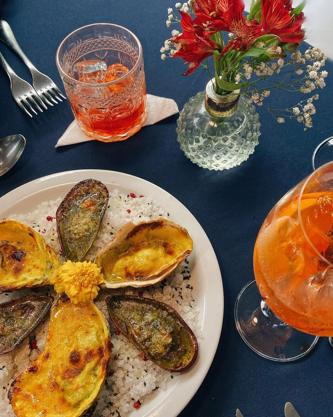 Esqueça os adereços em xadrez, bem característicos das cantinas italianas. O Aora Cucina recebe os clientes em uma casa histórica, no Quarto Distrito, que transporta nossa imaginação para uma cidadezinha no interior do país europeu. Quem nos recebeu na chegada foi a Alícia, proprietária que também nos apresentou o estabelecimento. Sem nada pitoresco, a alma italiana está nos detalhes – como a parreira e a árvore de limão-siciliano no pátio – e no sabor da comida. O restaurante tem luz baixa e, no salão principal, a iluminação mais intensa vem do enorme balcão aberto para a cozinha, que nos permite enxergar a preparação dos pratos pelo Chef Claudio Mesquita. Apesar de ser um restaurante “jovem”, já conquistou lugar consagrado, com prêmios e reconhecimento na capital gaúcha. Durante a enchente de maio de 2024, o Aora foi atingido e houve uma comoção muito grande entre os clientes que comemoraram o retorno.
