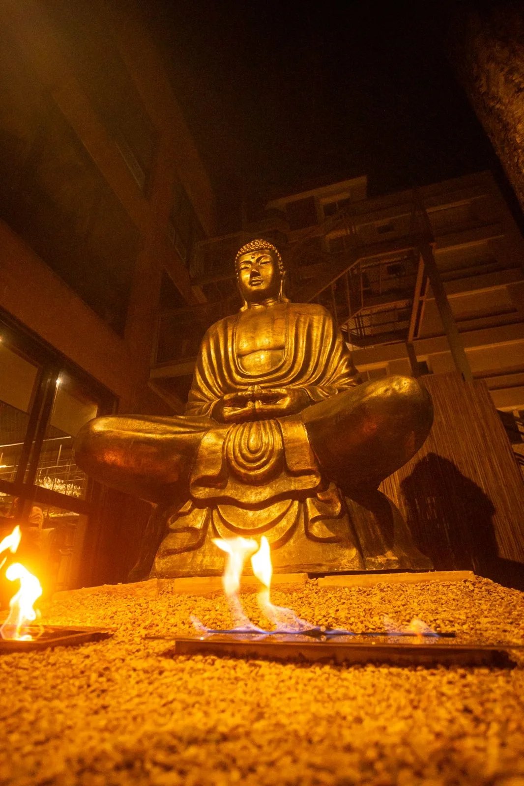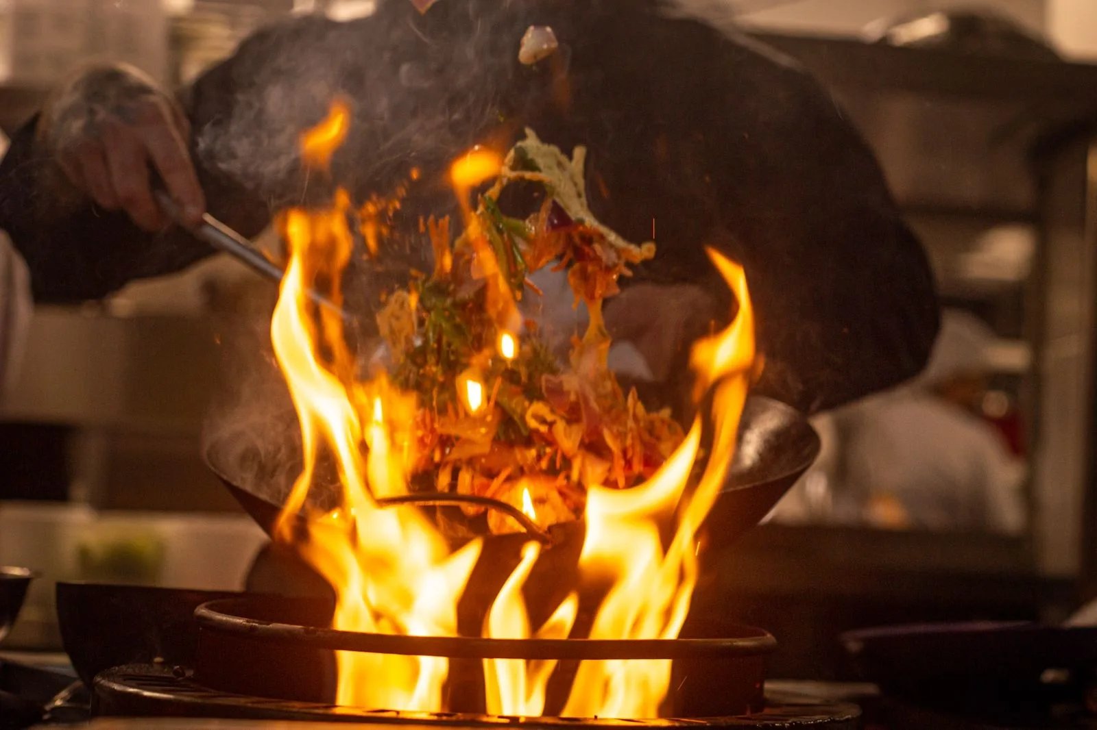 Talvez tu encontre um lugar para estacionar o carro um pouco longe do Asiana. Mas isso nem sempre é um problema. Caminhar um pouco pela charmosa Rua Dinarte Ribeiro pode, também, fazer parte da experiência. O mesmo vale se tu for de táxi ou transporte de aplicativo. O restaurante fica no segundo andar da Galeria Casa Prado, um prédio cheio de luzinhas que dão um ar tri cativante logo na chegada. Subimos as escadas e cruzamos uma área de recepção com uma estante enorme, cheia de itens de origem asiática. A recepção do restaurante em si fica por conta de uma gigantesca estátua de Buda e dos simpáticos garçons. A luz é baixa, o que torna o ambiente perfeito para um jantar romântico – mas a gente foi entre amigos e indica também! É incrível assistir à preparação dos pratos de qualquer lugar do salão e, ser surpreendido pelas labaredas de fogo que tornam aquela preparação um espetáculo a parte.