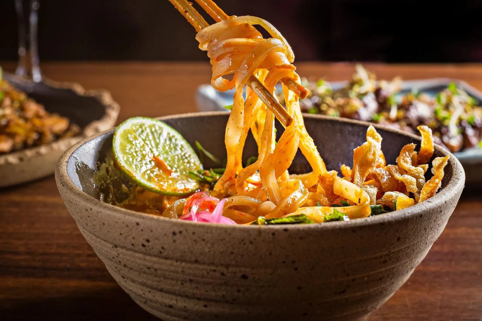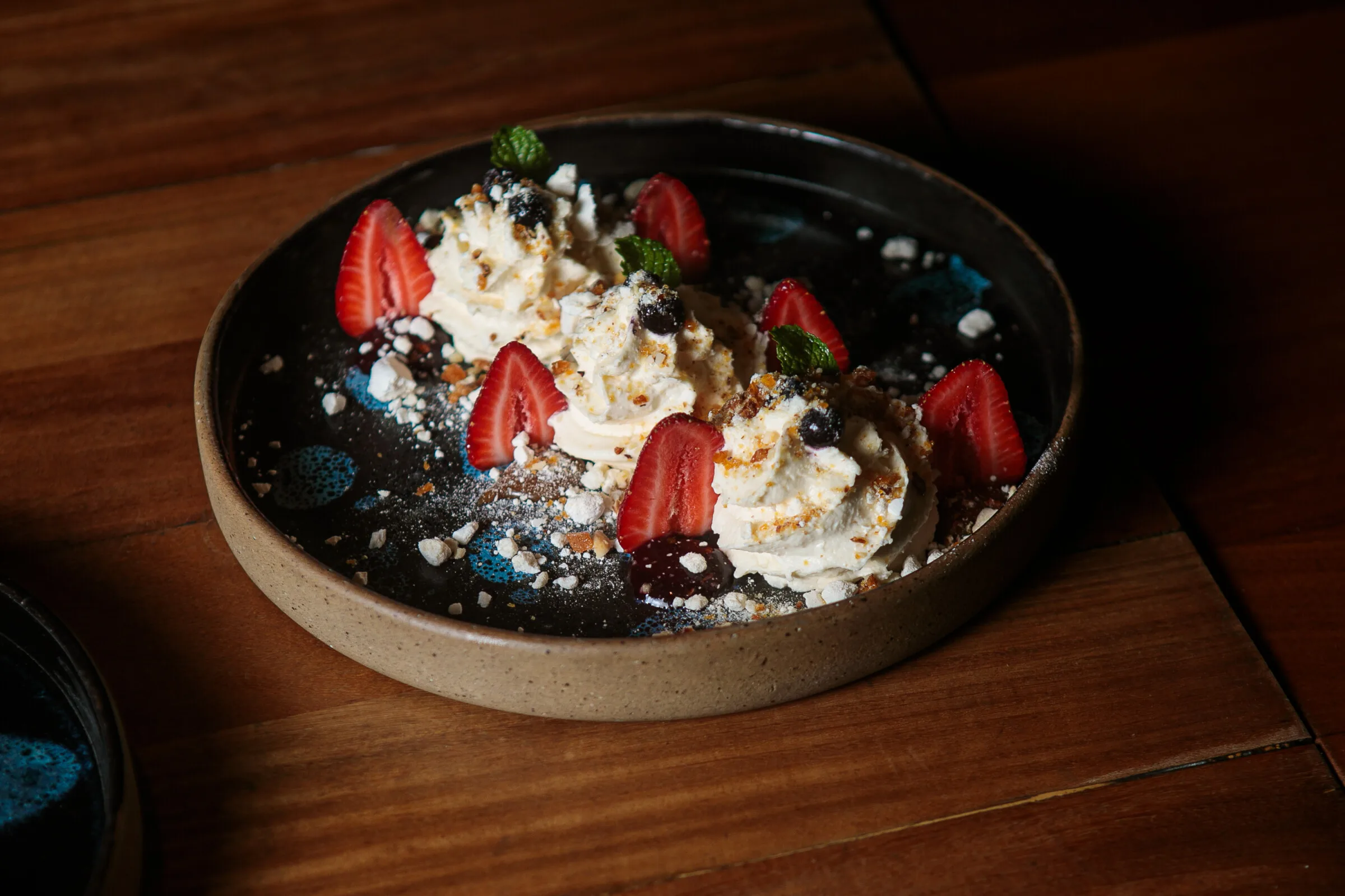 Com muitas opções de países como Tailândia, Japão, China, Malásia, Indonésia e até Cambodja e Vietnã, decidimos seguir as Sugestões do Chef, que ficam na primeira página do cardápio. Se tem alguém que sabe o que tem de bom, é quem elaborou tudo! Tuna Steak é o prato com a assinatura do Chef Victor Jongh. Um atum selado no ponto perfeito, que é uma explosão de sabores na boca. Em duas pessoas, optamos por dividir, também, o Mee Goreng Mamak. Prato de origem malaia, com aquela picância que já falamos, com destaque para o polvo bem suculento e os camarões. No próprio cardápio há referência do grau de intensidade da pimenta, além de identificar as refeições sem glúten. Se no alimento viajamos para o outro lado do mundo, na bebida preferimos ficar por aqui mesmo. Com uma carta muito variada e com incríveis vinhos brasileiros, optamos pelo Cabernet Franc da vinícola urbana Ruiz Gastaldo, aqui de Porto Alegre. A sobremesa foi algo mais leve… digamos! Chantilly e morango com merengue, frutas vermelhas e caramelo salgado.