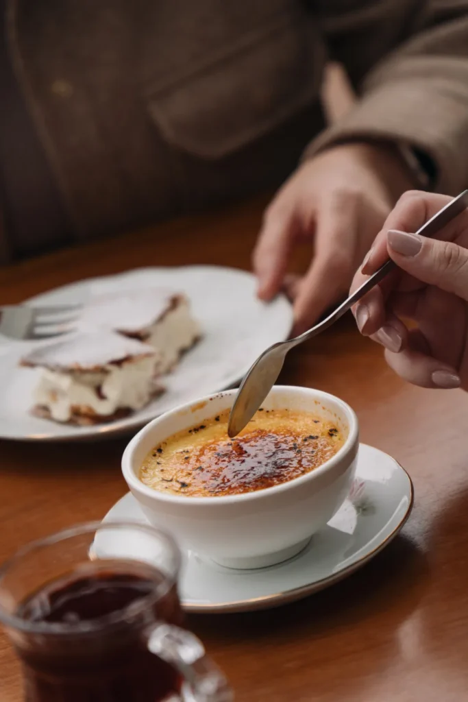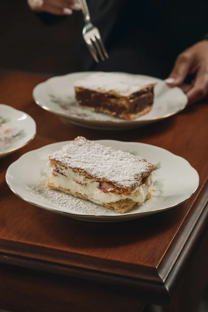 Na sua primeira visita, reserva alguns bons minutos para admirar todas as riquezas do lugar e depois passa para a hora mais saborosa. Nossas escolhas foram o carro-chefe da casa: mil-folhas de morango e uma fatia generosa da tradicional Marta Rocha. Para acompanhar um café extraído pelo método Hario V60 e um cappuccino, excelentes. O cardápio inclui opções salgadas como saladas e quiches, além de uma variedade de tortas artesanais e drinks clássicos. Outro destaque é a gentileza da equipe que aumenta ainda mais a sensação boa viver uma tarde na corte real.