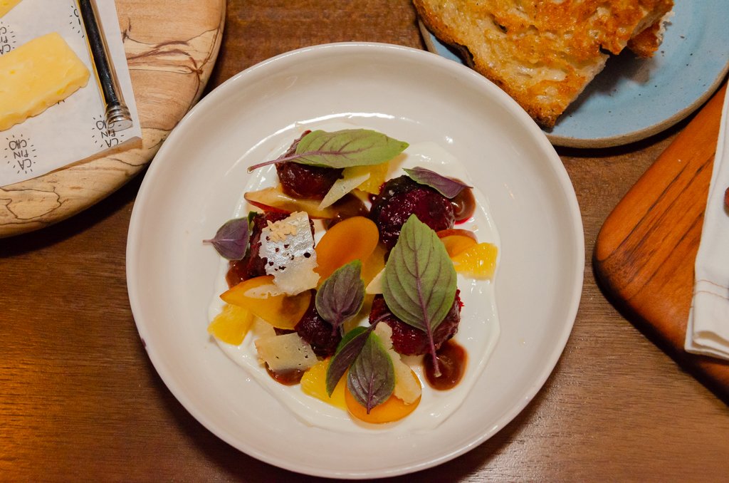 A culinária é outra estrela deste lugar cheio de encantos. O restaurante aceita reservas e tem um espaço mais amplo, embora com a mesma luz baixa e atmosfera acolhedora. A cozinha é vista por um enorme balcão, onde é possível acompanhar a preparação dos alimentos e perceber a dedicação colocada em cada prato. Em dias de tempo agradável, a dica é escolher uma das mesas do jardim. Já nas épocas mais frias, tu pode curtir o lugar bem aconchegado nos pelegos – tradicionais itens de montaria do gaúcho feito com couro de ovelha com sua lã natural – que são colocados sobre as cadeiras. Na formulação do cardápio, o chef Marcelo Schambeck oferece a reinterpretação contemporânea dos pratos gaúchos e a valorização de produtores locais. É um trabalho de formiguinha, em busca do que tem de melhor pelos pagos do Rio Grande. As entradas e pratos principais são fixos e, para começar, a gente provou uma seleção de queijos regionais com mel de Cambará do Sul. O prato mais pedido e grande estrela do menu traz um corte que é paixão dos gaúchos: a Costela do Dianteiro. Assada por 16h, ela se solta no garfo e derrete boca. Tem também as opções sazonais. Itens que estão no auge do sabor, em razão da época do ano e da safra. Provamos a beterraba com laranja, ameixa amarela, marmelo, coalhada de iogurte colonial curado, que acompanha pão de fermentação natural. Aposto que tu nunca provou uma beterraba tão deliciosa. As sobremesas seguem a mesma linha e a nossa indicação é o Merengue ácido, que leva framboesa, morango, baunilha e suspiro. Sobremesa tão deliciosa quanto linda!