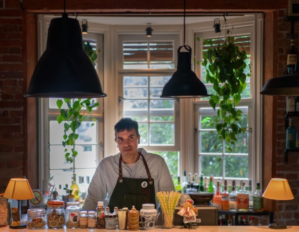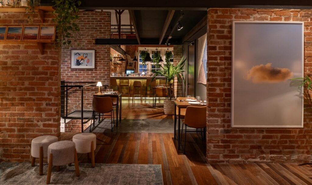 Em um casarão dos anos 1930, em frente à charmosa Praça Maurício Cardoso, no coração do bairro Moinhos de Vento, fica um portal para cores, sabores, texturas e aromas bem típicos do Sul. É ali que três especialistas fizeram morada. O chef Marcelo Schambeck, que comanda a cozinha, Flavia Mu, que faz a curadoria da decoração, lidera a equipe do salão e também é a sommelier da casa, e o bartender Fred Muller, que assina as criações do bar. Subindo as escadas, logo após passar por uma placa com a imagem de um capincho (como são chamadas as simpáticas capivaras aqui no Rio Grande do Sul), o cliente pode escolher entre o restaurante e jardim, no primeiro andar, ou o bar, no segundo piso.