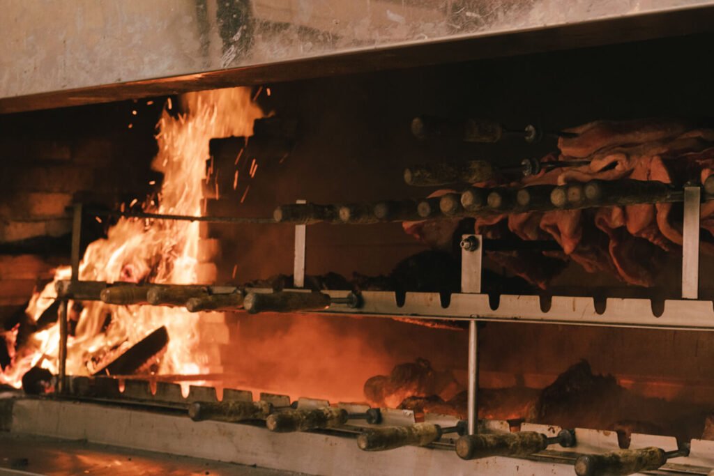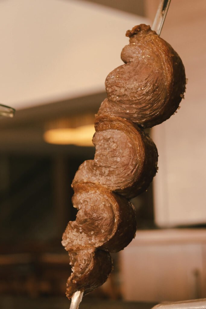 Nosso churrasco é feito no espeto e isso faz com que carnes mais gordurosas e com osso fiquem especialmente maravilhosas, além de viabilizar o “espeto corrido” – um jeito único de servir o assado. Funciona assim: a peça sai direto da churrasqueira para as mesas. O garçom usa um prato de apoio e vai circulando, cortando pedaços da carne direto do espeto. Quem prefere bem passada, pega uma “lasquinha”, quem gosta de mal passada, um pedaço mais grosso. É uma espécie de rodízio, onde são oferecidos diferentes tipos de carne, como picanha, maminha, vazio (que é a forma como chamamos a fraldinha – já anota a dica) e costela. Mas também tem opções como coração de galinha, linguiça, salsichão e um bom pãozinho com alho. As saladas costumam completar o cardápio.