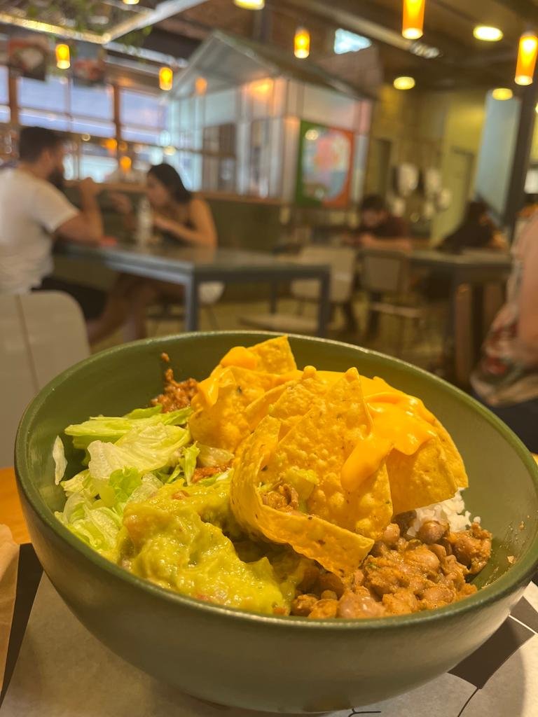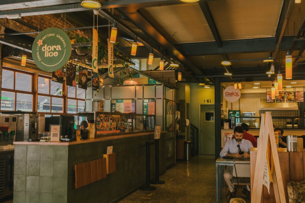 O Espaço tem também duas operações de refeições. A DoraLice tem sanduíches e pratos tradicionais, mas sempre com uma pitada de criatividade! O PF (prato feito), por exemplo, tem arroz cateto, salada de feijão, farofa de banana e ovo cozido – e tu escolhe se prefere a opção de frango ou de cogumelo. Tem também a versão inspirada na cozinha da vó, com carne de panela. O Oaks tem burritos e bowls, com sabores de inspiração Tex-Mex, que é a fusão da cozinha mexicana com a estadunidense (especialmente Texas, que fica bem na fronteira dos EUA com o México).