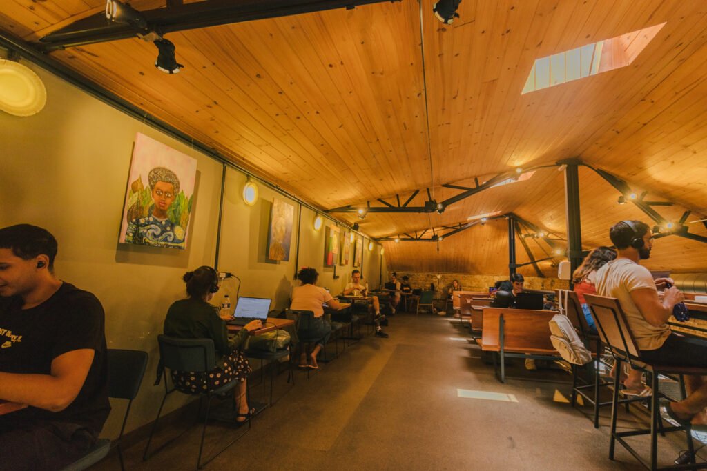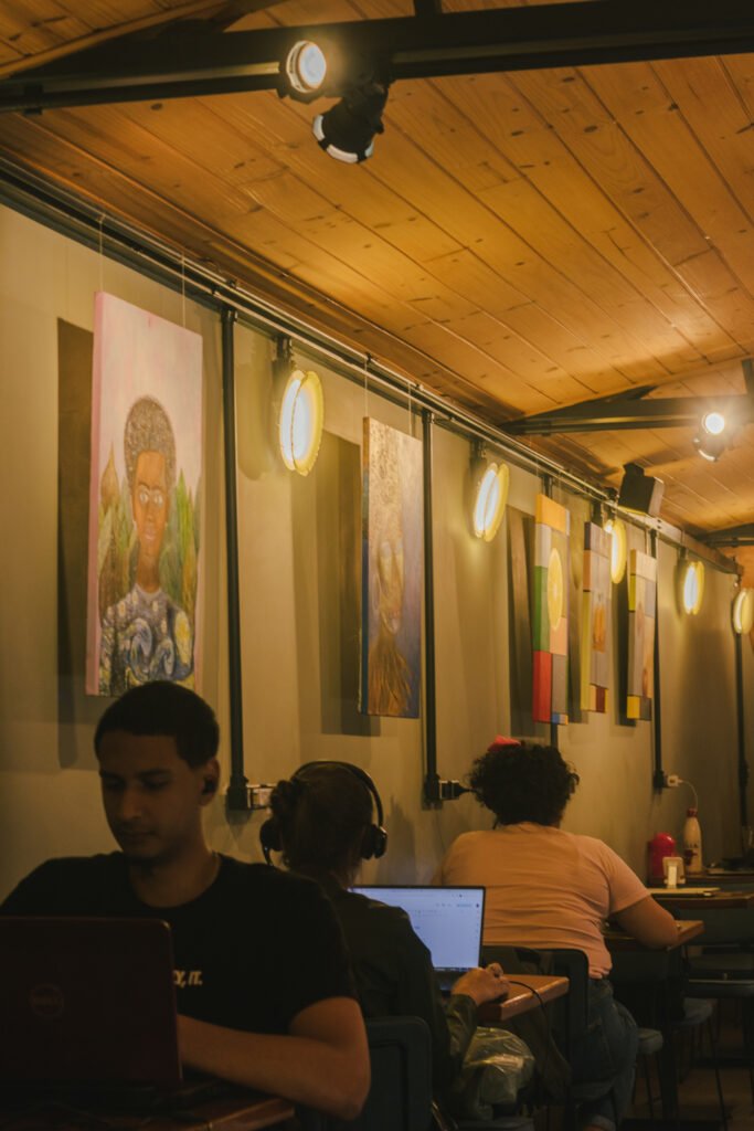 O Brasco é um lugar absolutamente “work friendly”. O mezanino funciona como coworking e é de graça para quem quiser chegar com seu computador e/ou equipamentos para trabalhar. O wi-fi é liberado e, sim! Tem bastante tomadas espalhadas. Não é obrigado consumir nada do local, mas duvido que tu abra mão de pelo menos tomar um cafézinho! Há espaço para até 40 pessoas compartilhando mesas. Um detalhe incrível é que os quadros que compõem a decoração são feitos pelo artista plástico Edson Lima, que também trabalha no Oaks. Ele faz releitura de obras autorais com foco na identidade negra e na cultura africana. E todos estão à venda!