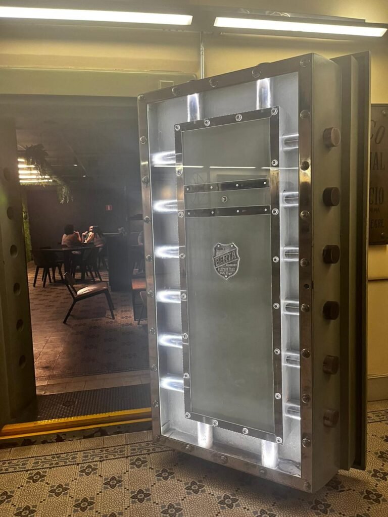 O prédio foi construído em 1927 e já abrigou alguns bancos importantes da capital, incluindo o Banco Sul Brasileiro. É no espaço onde funcionava um dos cofres que queremos chegar. Procure as escadas centrais e desça por elas. Um piano de cauda e a porta original do cofre te recepcionam, dando boas vindas com um ar de mistério, o que virá a seguir? Paredes que antes contavam histórias de transações financeiras, agora sussurram segredos artísticos. O ambiente foi restaurado, está moderno, mas é impossível não perceber que ali era um banco. Nas paredes, placas antigas da instituição financeira e cofres embutidos, contando a segura história que aquele subsolo já guardou.