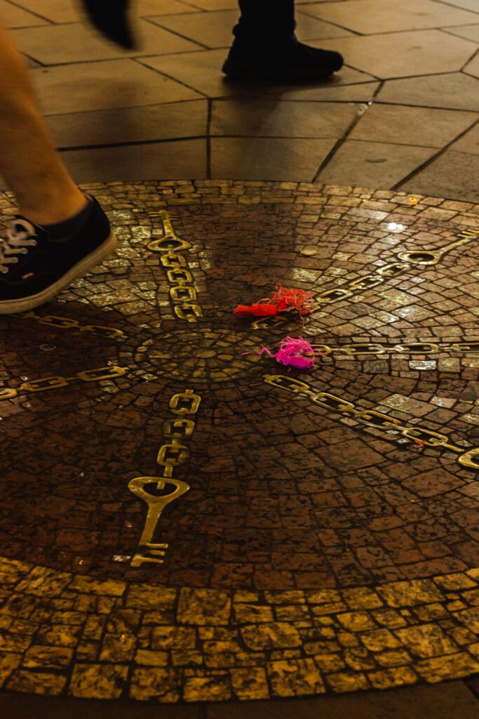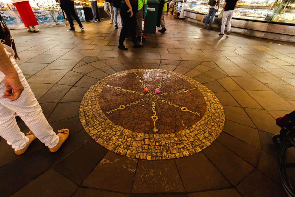 Ao chegar na encruzilhada dos quatro corredores centrais há um mosaico de pedras e bronze. Não estranha se tu sentir uma vibração diferente, pois é aí que está o Bará do Mercado. Para as religiões de matriz africana, o orixá tem o poder de abrir caminhos e foi parar ali depois de ser assentado, ou seja, fixado em algum objeto através de rituais. O Bará também é o senhor da fartura e do trabalho, por isso, muita gente vai até o local e deixa moedas e/ou presentes para ele. Existe, ainda, a crença de que uma energia protege o prédio há gerações (talvez isso explique a preservação do prédio, mesmo depois de tantos incidentes). Há duas versões sobre quem fez o assentamento. A primeira é de que foram os escravos na época da construção. Alguns religiosos, porém, acreditam que foi obra do Príncipe Custódio, que chegou ao Brasil quando o Mercado já existia.