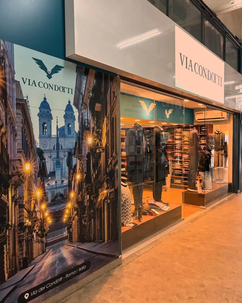 A Via Condotti é uma loja multimarcas de moda masculina. Inspirada no estilo italiano, oferece uma variedade de produtos como sapatos, camisas, camisetas, calças e calças jeans.