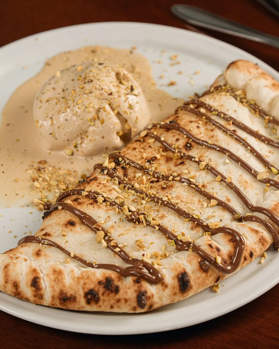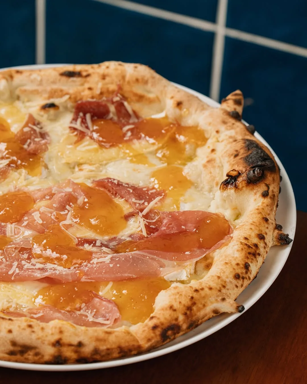 A Delizioso Brie e Prosciutto aposta na cremosidade da base bianca de mozzarella de búfala e queijo brie, finalizada com presunto cru, parmesão uruguaio e um toque agridoce à escolha do cliente — entre geleia de damasco ou sweet chilli sauce.