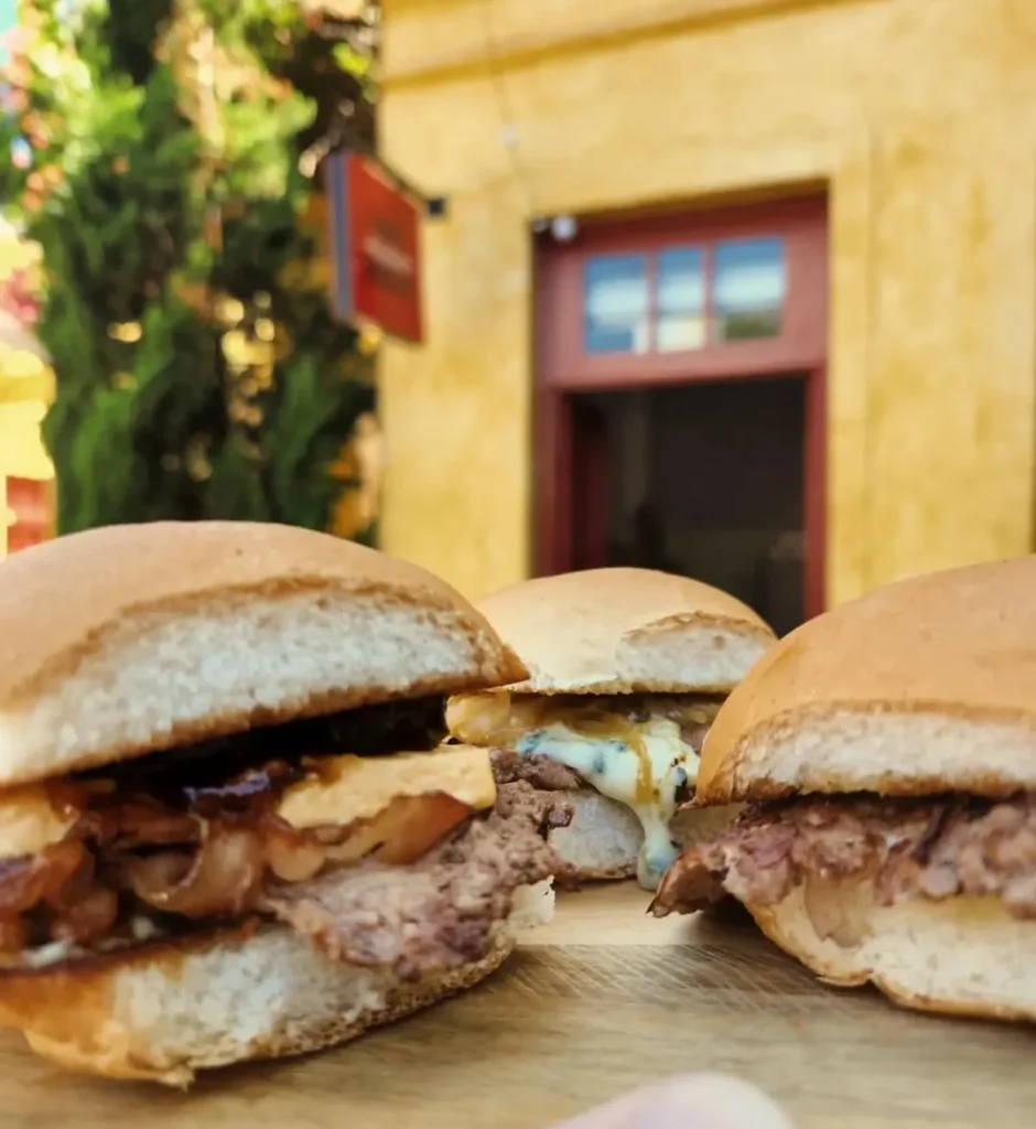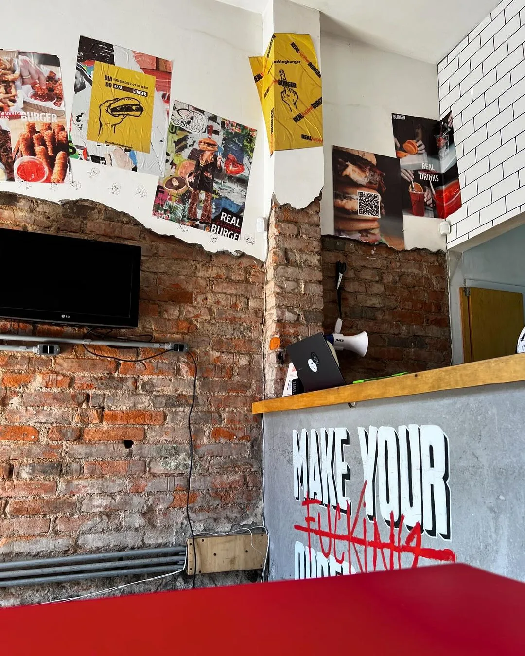 O símbolo da hamburgueria é uma senhora idosa usando óculos escuros enquanto aprecia um drink, essa é a vibe do Real Fucking Burger. Lugar descontraído que oferece hambúrgueres clássicos.